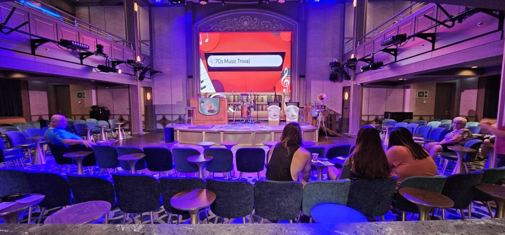 Music Trivia is a sit‑down quiz, usually in one of the lounges, that pulls from everything from classic rock to Disney soundtracks depending on the theme. It’s a great option if you love storytelling through music, want something mentally engaging but not exhausting, and prefer sipping a good drink in a comfy chair over anything resembling a “party scene.”